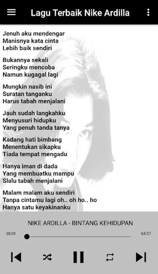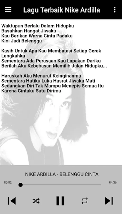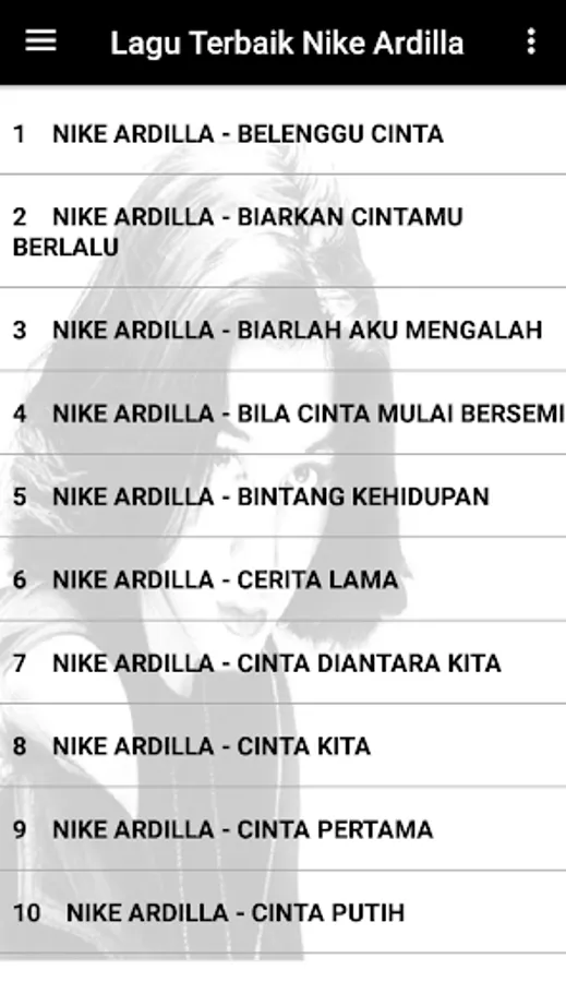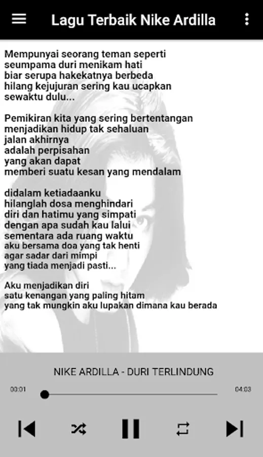 There are many ways to find the Nike Ardilla full album application because we provide complete Nella Kharisma offline songs, and this application feature is ready for the Nike Ardilla full album song, a collection of offline Nike Ardilla songs in this Nike Ardilla mp3 application.