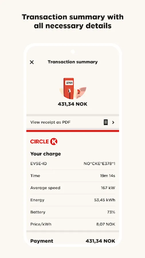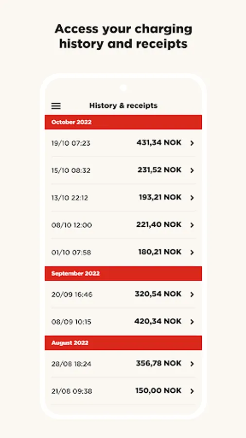 You will be able to find an overview of your charging history in the app menu. This makes it easy to find previous charging stops, pricing, charging time and average speed.