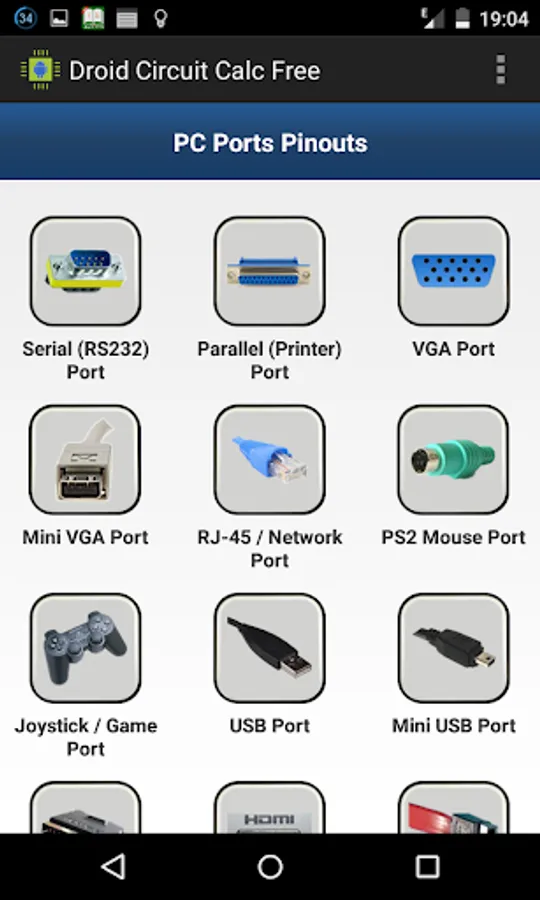 * Different PC ports pinouts (like serial port, parallel port, joystick or game port, USB port, VGA port, mini VGA, PS2 mouse port, network port, mini USB, S Video, Scart Port, HDMI Port, Firewire (IEEE 1394) Port, GPIB Port, Sata, DVI (Digital Video Interface) Port, Extended IDE Port and Apple 30 pin Dock Port)