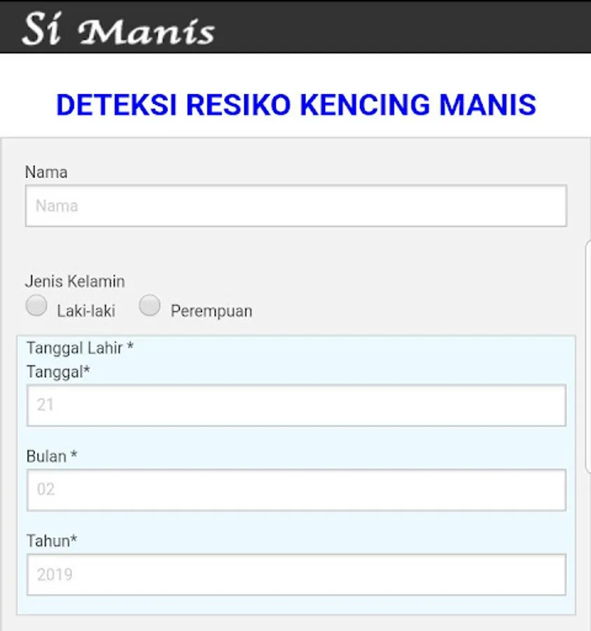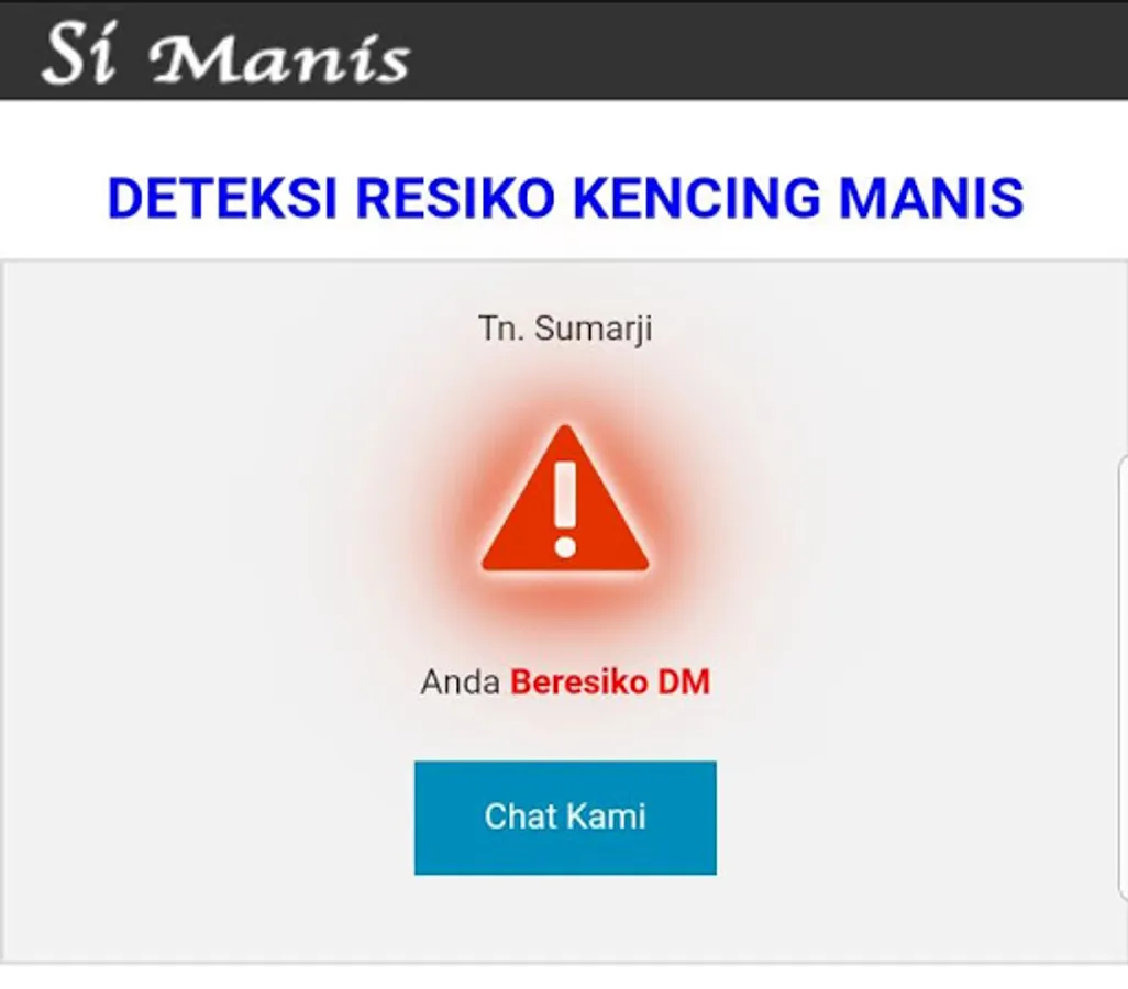 Sweet is a health-based application to detect early occurrence of Diabetes Mellitus in someone. This application can provide information to someone, especially ordinary people, whether there is or not the risk of exact killer disease, namely diabetes mellitus so that the information can be followed up earlier. Diabetes Mellitus (DM) is a disease that is very dangerous because it can threaten the life of the sufferer, this disease cannot be cured, but if detected early through further investigation it can be controlled by a regular diet, taking medication regularly and diligently controlling the doctor with regularly so that it can increase the patient's survival rate. The parameters used in this application in detecting someone with DM risk are the age of the patient, gender, family history with DM, habits of physical activity / exercise, weight (American Diabetes Association, 2018).