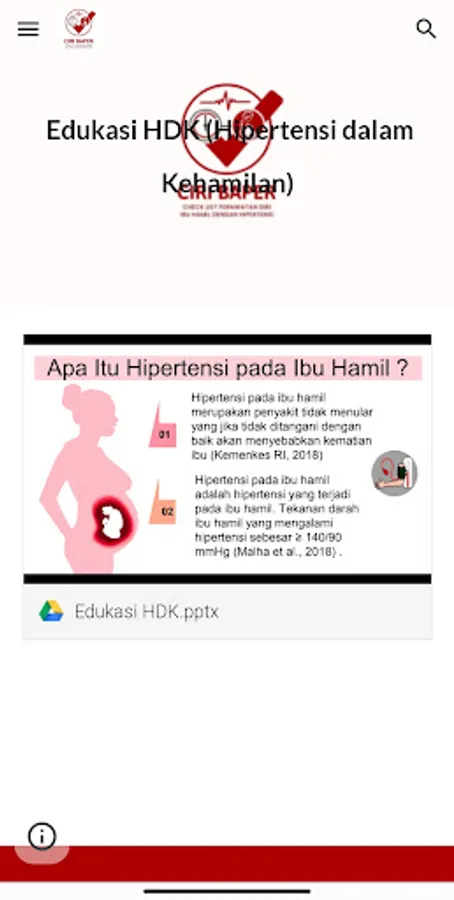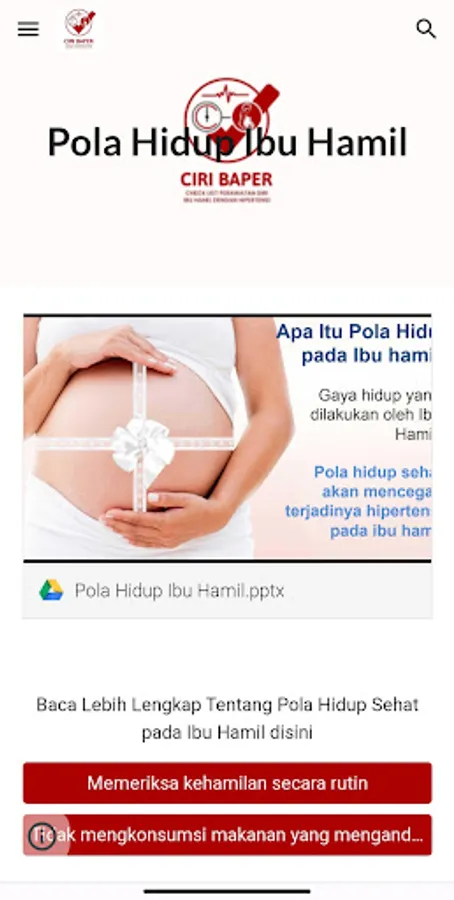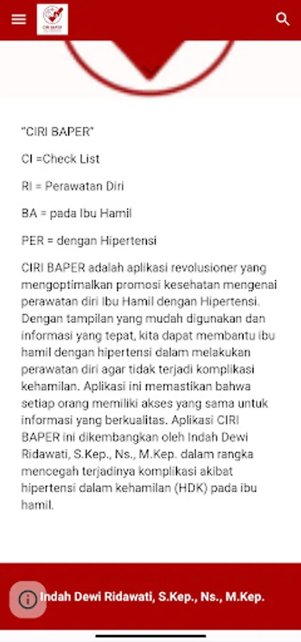 CIRI BAPER is a revolutionary application that optimizes health promotion regarding self-care for Pregnant Women with Hypertension. With an easy-to-use display and the right information, we can help pregnant women with hypertension in taking care of themselves so that pregnancy complications do not occur. This app ensures that everyone has equal access to quality information. The CIRI BAPER application was developed by Indah Dewi Ridawati, S.Kep., Ns., M.Kep. in order to prevent complications due to hypertension in pregnancy (HDK) in pregnant women.