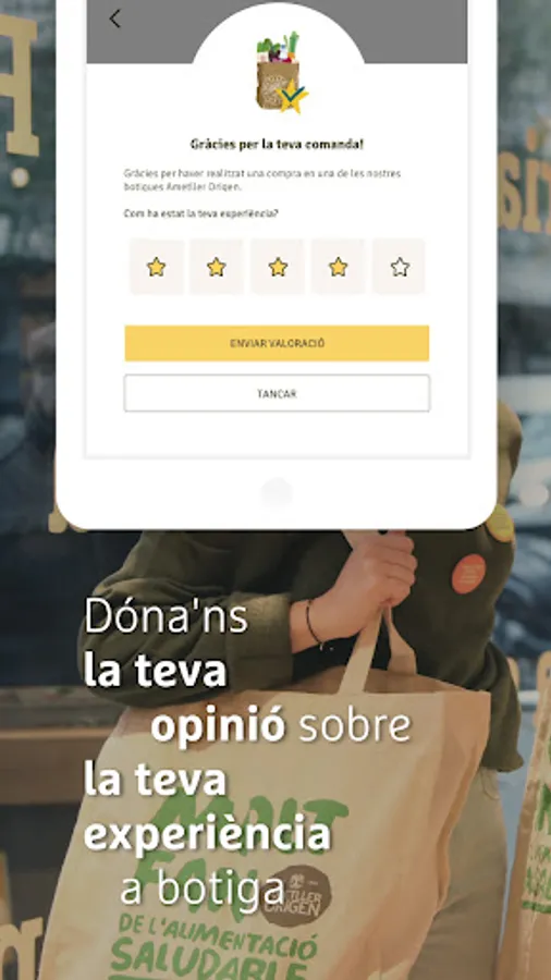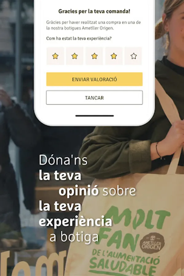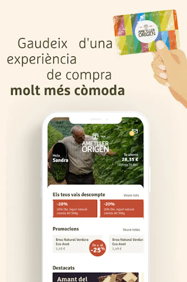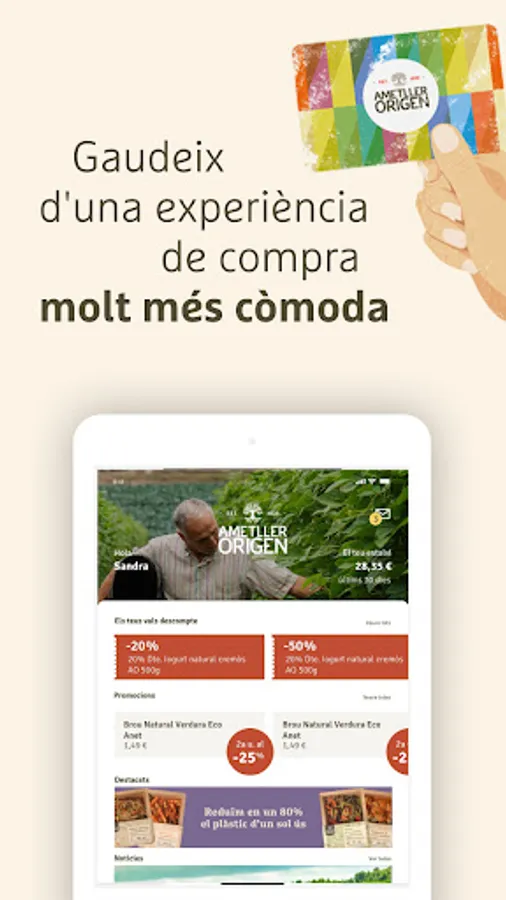 We want to be close to you and help you follow a balanced, healthy and sustainable diet. With the Ametller Origen App, you can choose the discounts you like best, activate your coupons, give us your opinion, check your tickets and much more.
