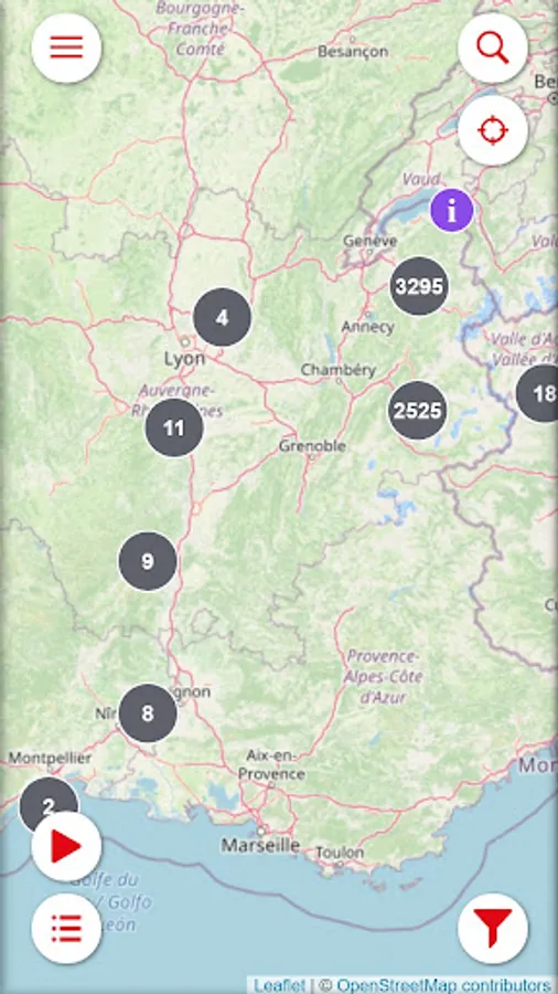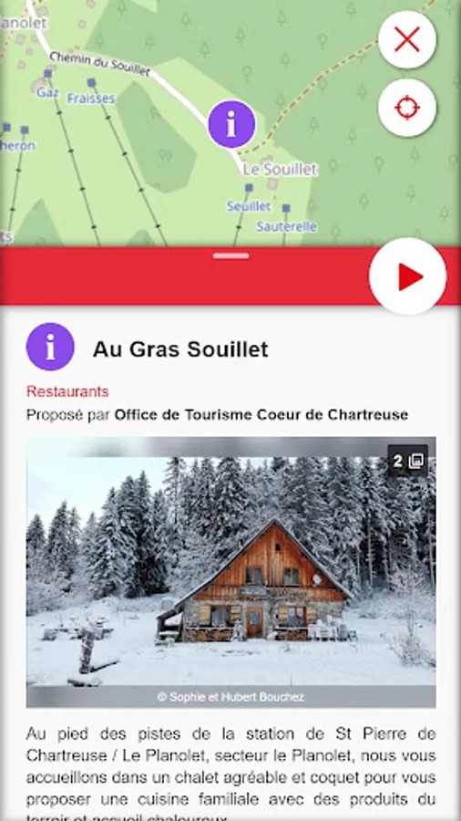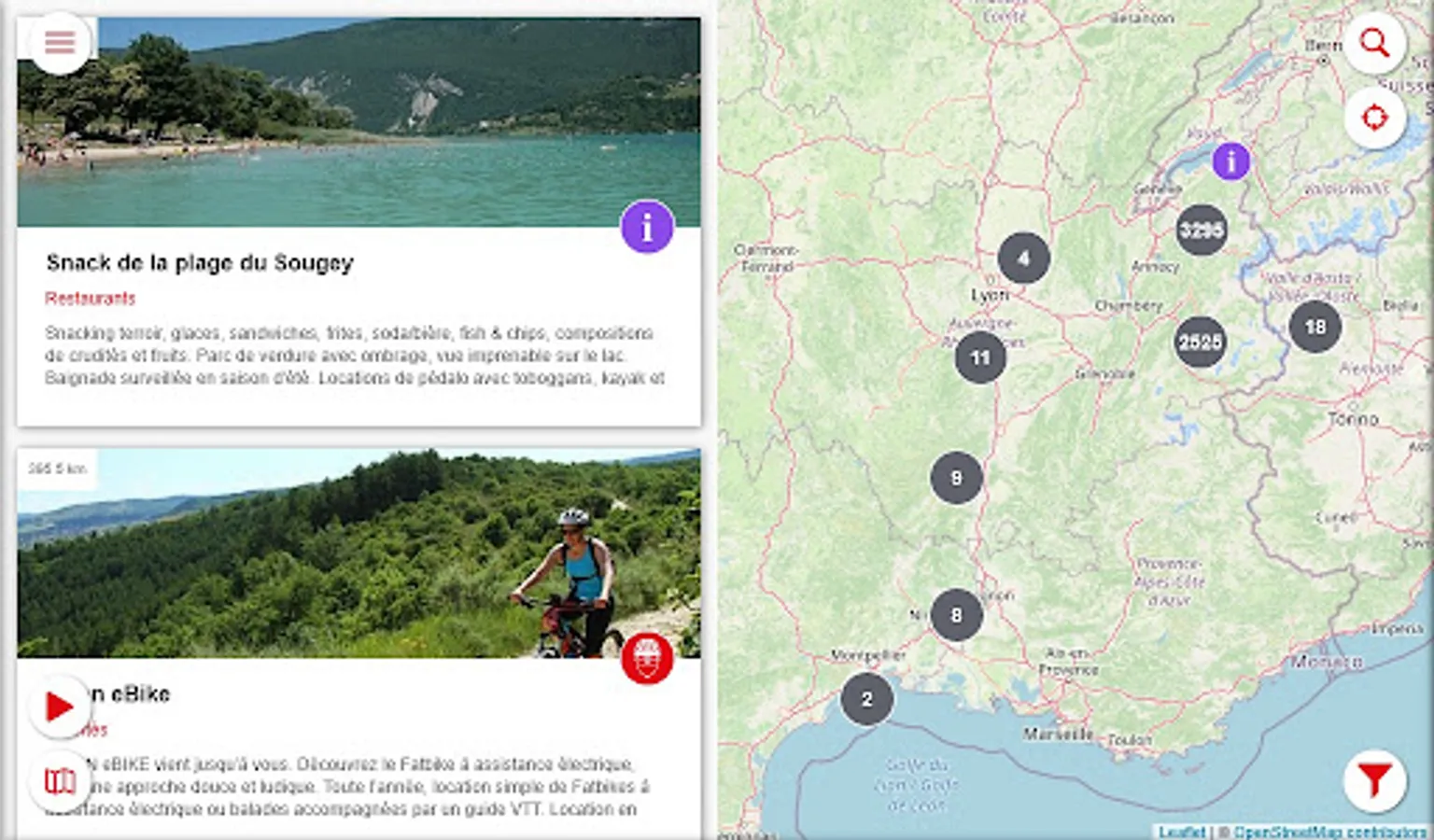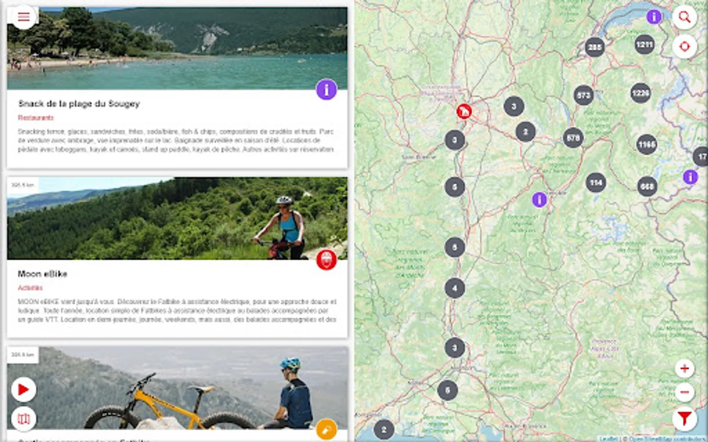 • The locations of useful services: tourist offices, bike shops, Mountain bike rentals, food shops, restaurants, bars, motorhome service areas, ski-lifts open for mountain bikes