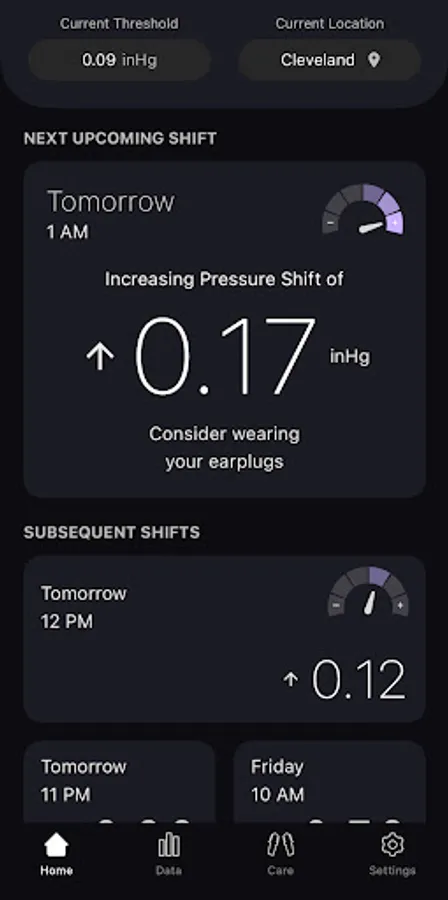 The WeatherX app provides an accurate hourly barometric forecast for your location. Customize pressure shift notifications will help inform you when it’s best to use your WeatherX earplugs.