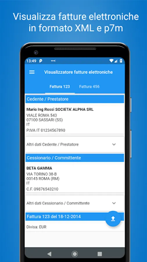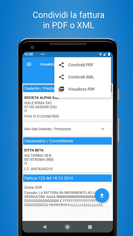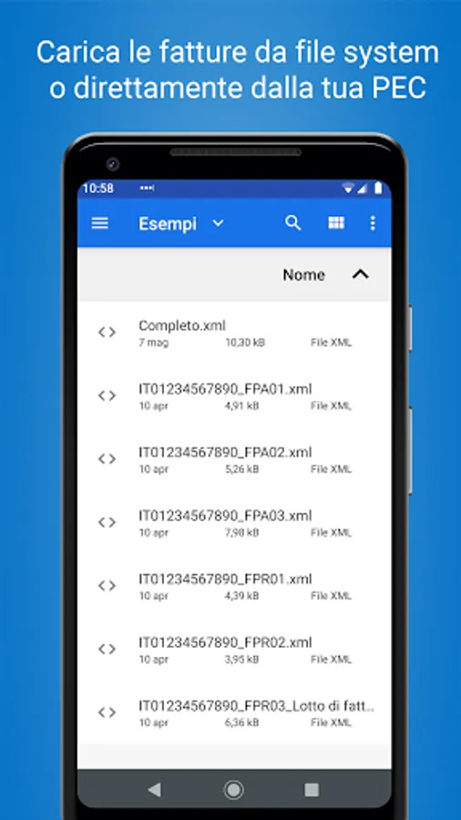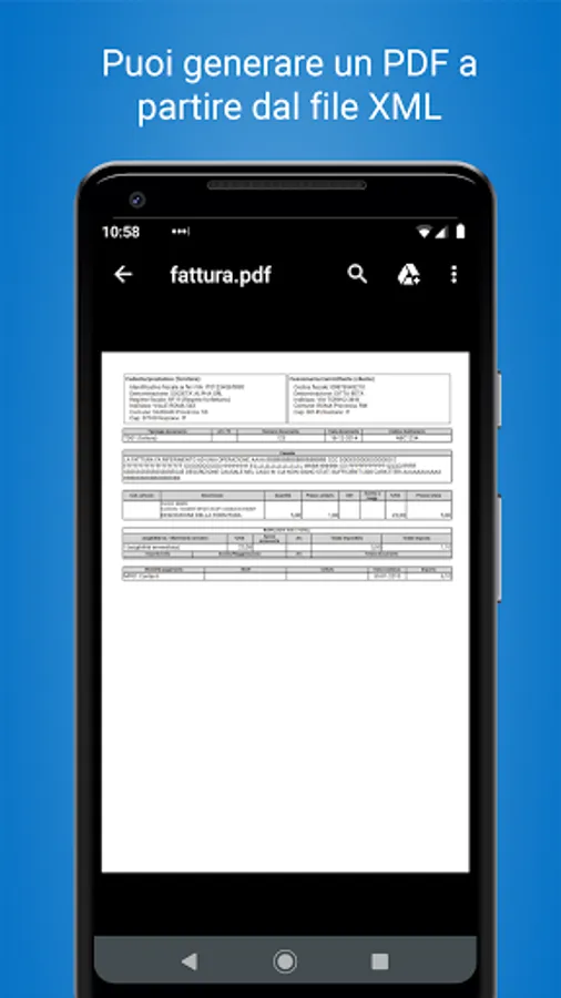 Simply consult in your smartphone the electronic invoices you receive from your PEC certified email or open the files saved on your phone in xml or p7m format. Generate invoice in pdf from the xml files compatible with the specifications of the ES interchange system.