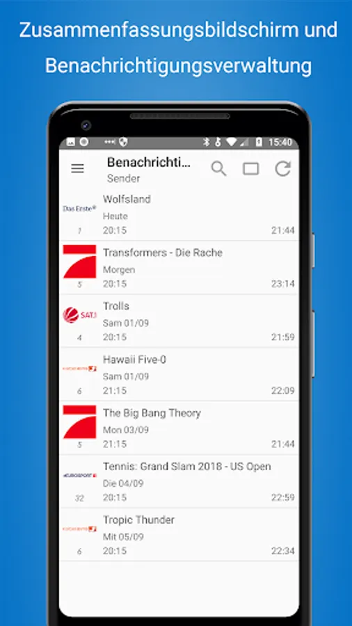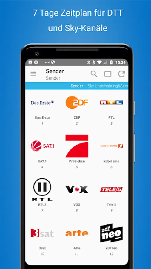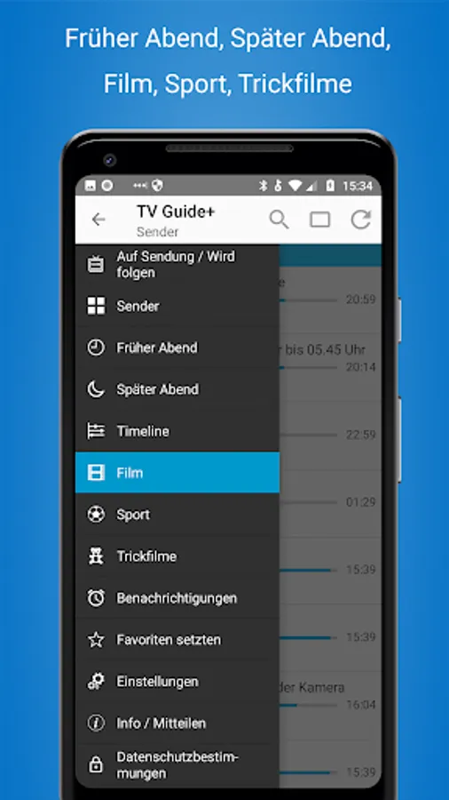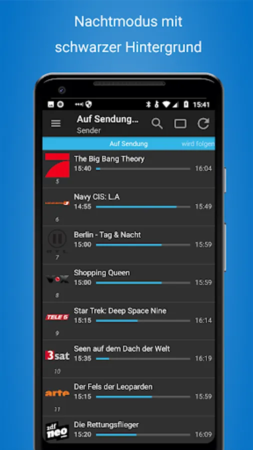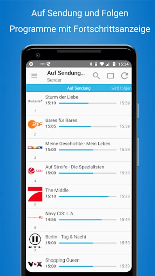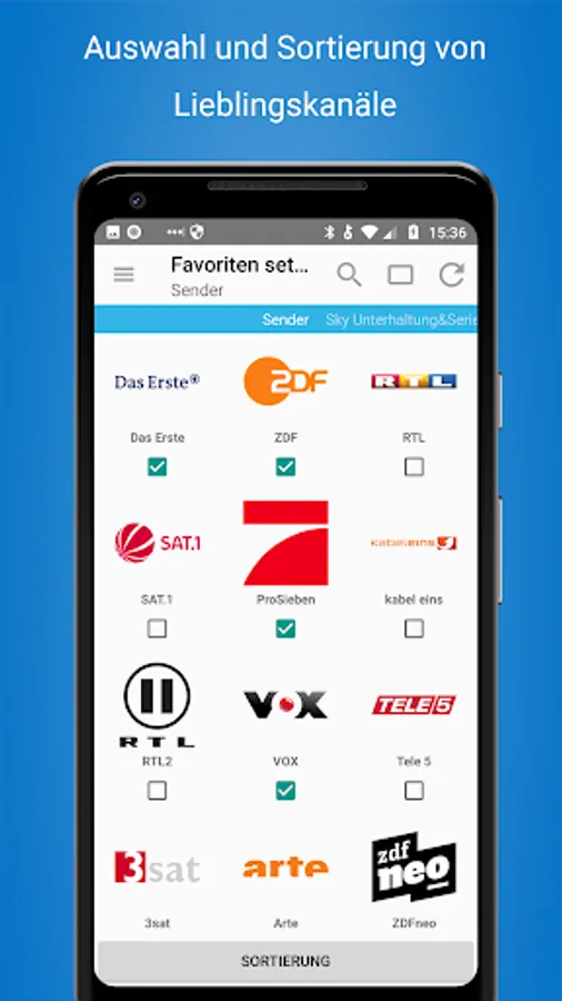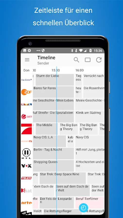 For programs currently on air, a bar is shown that visually indicates how long the broadcast has started and how long it is until the end of the broadcast. You have a handy timeline for an overview of the schedules and sections where only movies, sports programs and cartoons are listed. You can set your favorite channels in order to make the consultation faster.