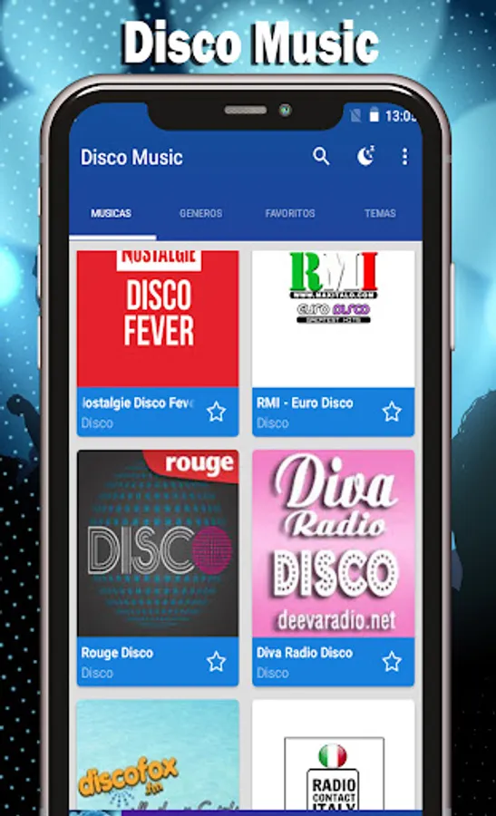 In this application you will find many Disco Music music station to enjoy online, diversity of Disco Music 70 80 90 selected exclusively for this app.