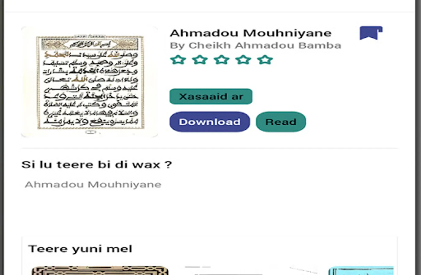 Ahmadou Bamba Mbacke (Wolof: Ahmadu Bamba Mbacke, Arabic: أحمد بن محمد بن حبيب الله Aḥmad Ibn Muḥammad Ibn ḥabīb Allāh, 1853–1927) [1] Also Known to followers as khādimu ' of the Messenger" and Serigne Touba or "Sheikh of Tuubaa", was a Sufi saint (Wali) and religious leader in Senegal and the founder of the large Mouride Brotherhood (the Muridiyya). Mbacke produced poems and tracts on meditation, rituals, work, and Quranic study. He led a pacifist struggle against the French colonial empire traveling across the Atlantic ocean while not waging outright war on the French like several prominent Tijani marabouts had done.