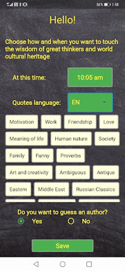 1. Select the topics for the quotes that interesting for you (more than 20 different topics are available)