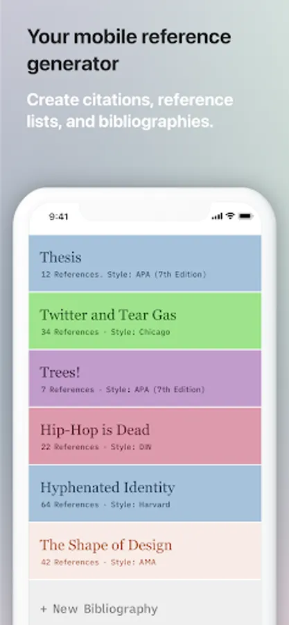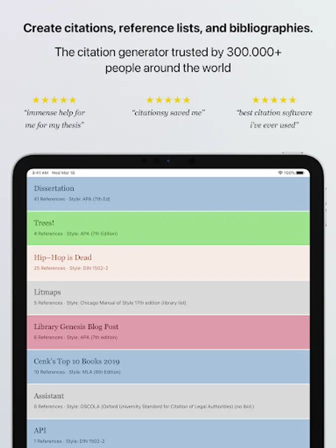 With Citationsy you can organise your citations into different projects and export them in over 9,000 different styles (APA, Harvard, Chicago, MLA, DIN, and everything else). It includes search engines for books, music, podcast, and scientific papers to make finding the sources you want to cite even easier.