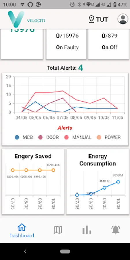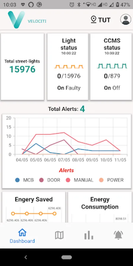 Dashboard - pages gives an overview of the city. It tells the user the number of street lights, and the number that is faulty, the number of smart controllers, etc. This page also includes charts that plot the trend of energy saved, energy consumed and the total number of alerts generated. This helps in quick decision making for users. The user can also set the alert chart as per their needs.