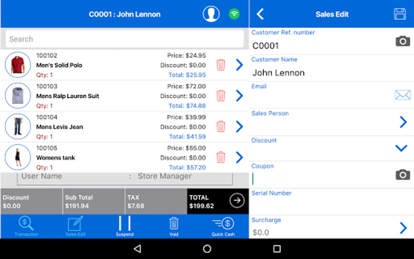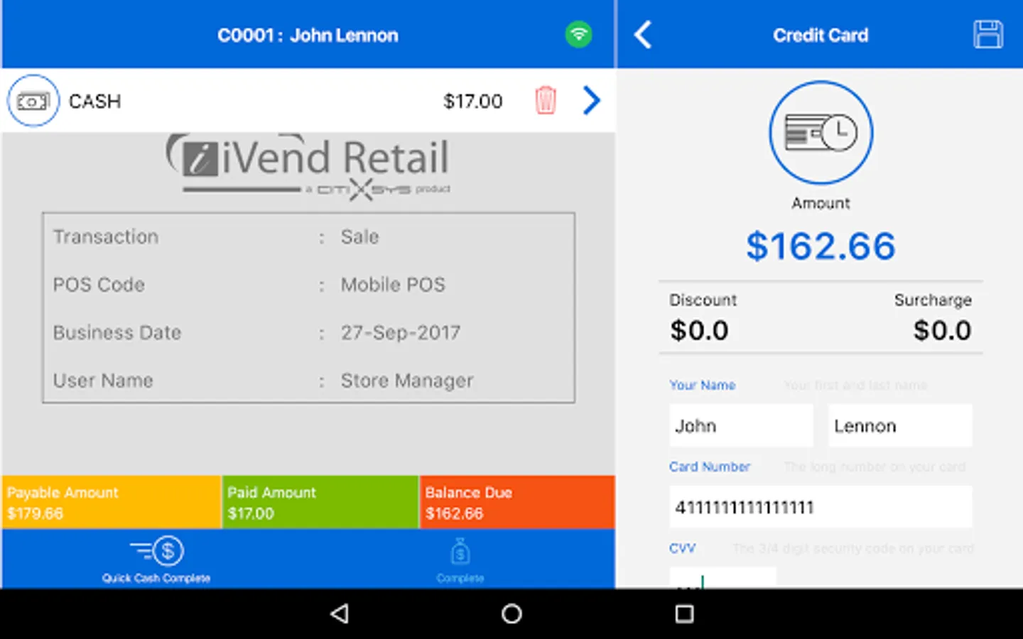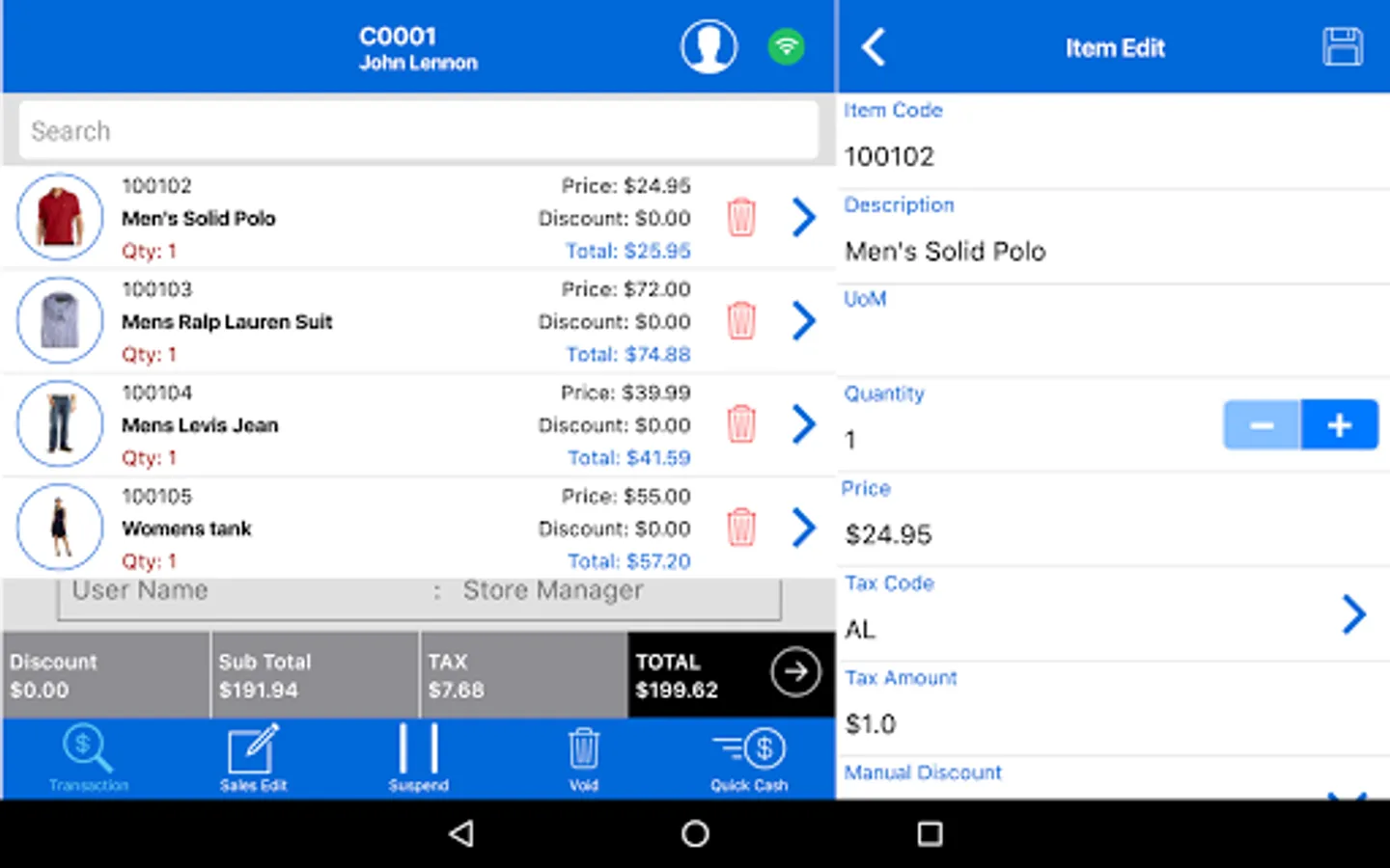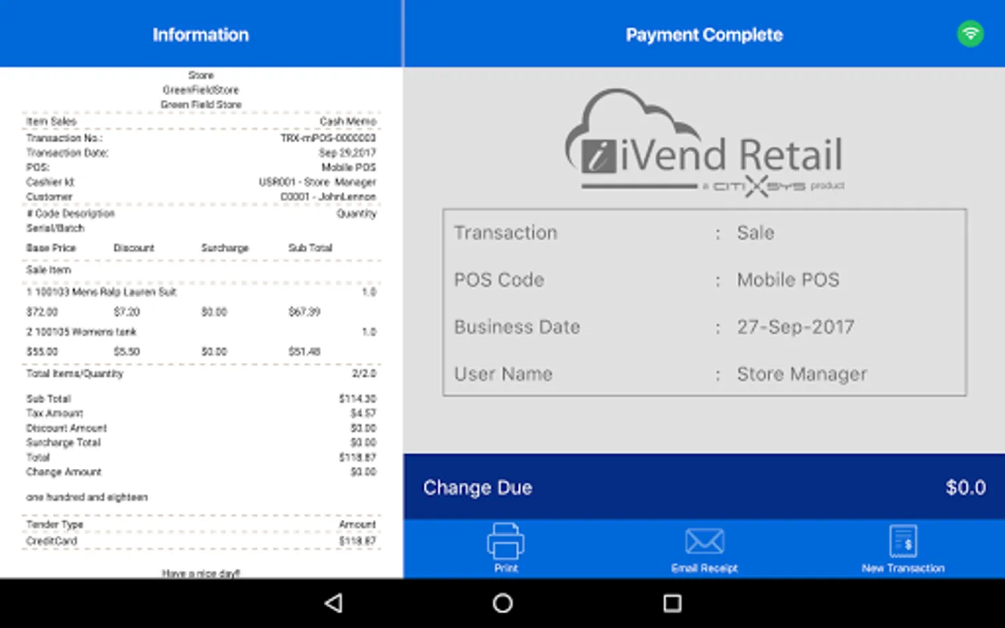 iVend Mobile POS gives complete Point of Sale functionality for iVend Retail 6.6 on Android Phones (4" and above) and Tablets (7", 8" and 10") running Android OS 5.0 and above. iVend Mobile POS is well suited for retail stores of all sizes. Retailers must be running iVend Retail 6.6 as their enterprise retail server to use iVend Mobile POS as a Point of Sale. iVend Mobile POS connects with iVend Server over WiFi or 3G/ 4G/ LTE in online mode but is also designed to work when there is no network connectivity on an offline mode.