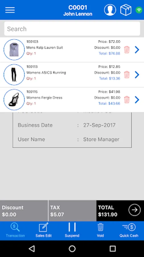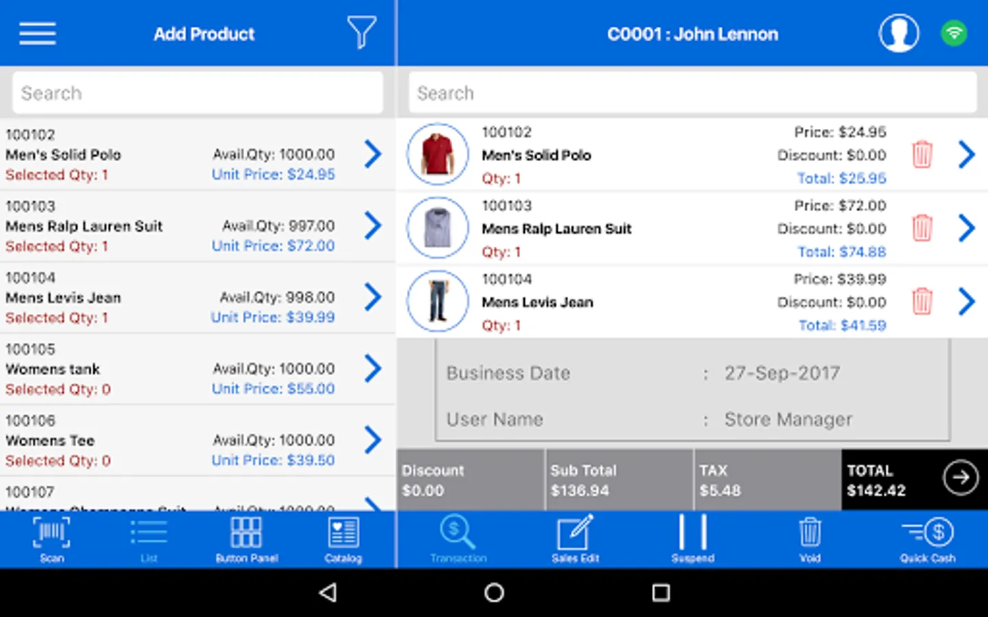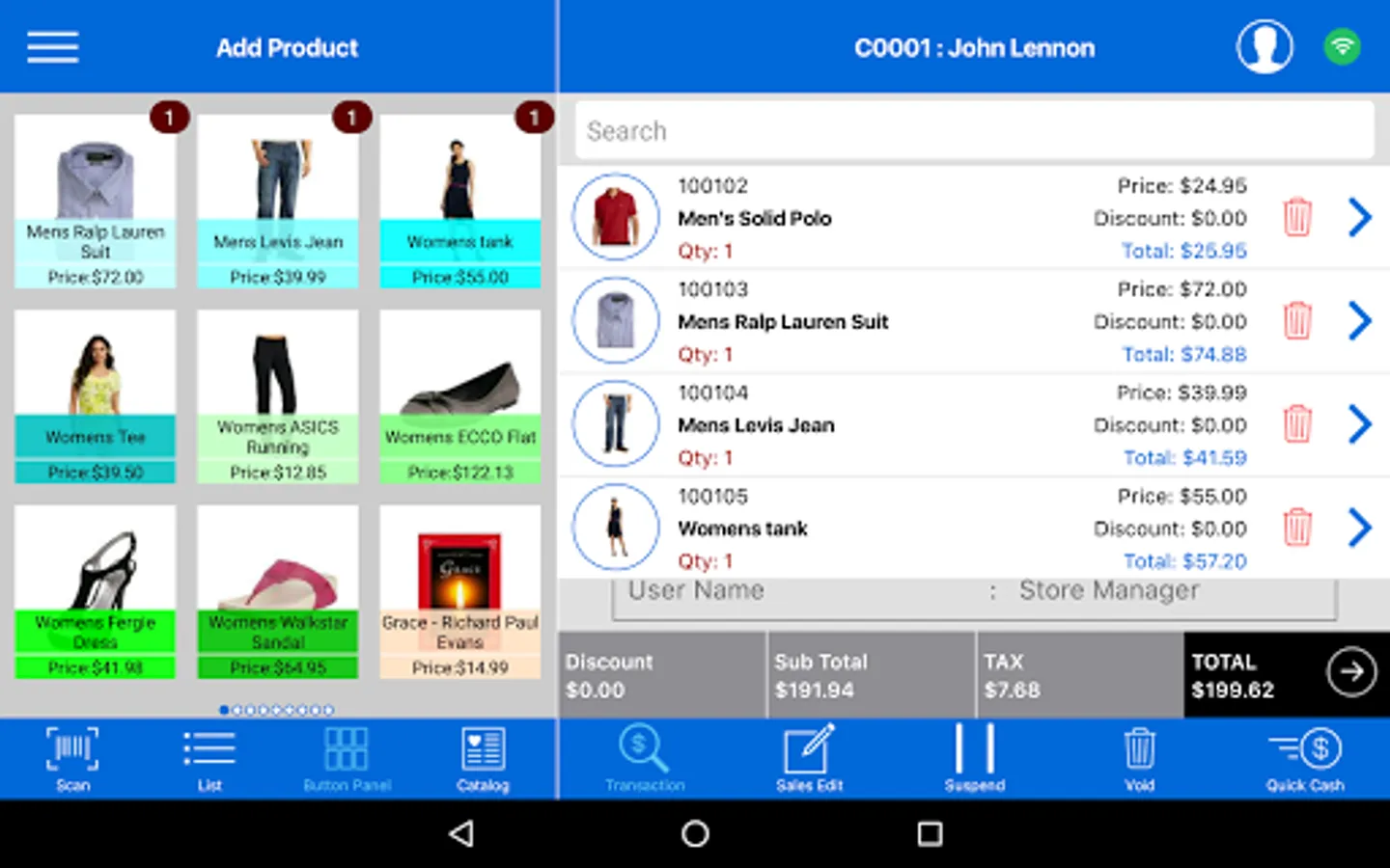 • Add products by selecting from product list, by scanning barcode, by selecting from quick button panel