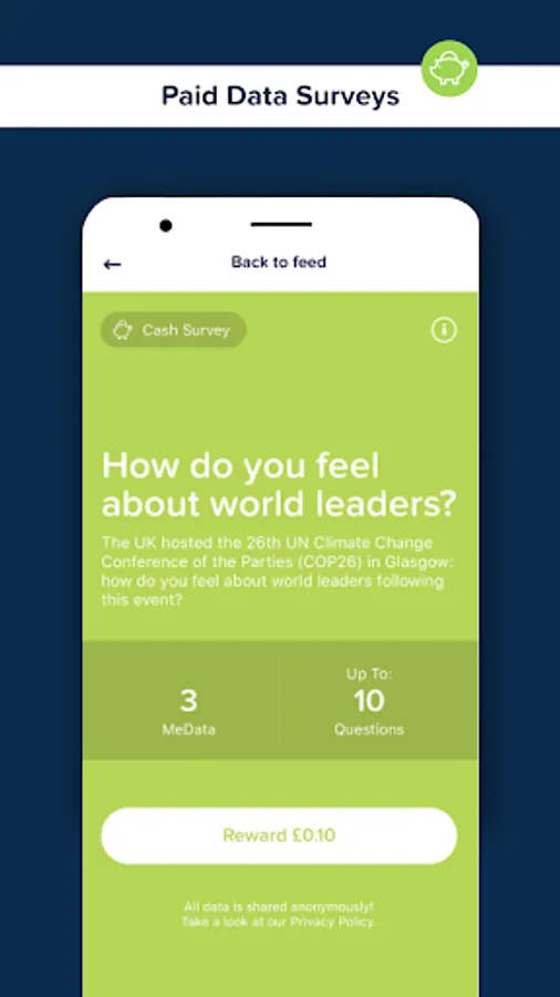 - The green coloured tiles in the app are the one that give you a cash reward for sharing your opinions. The first time you try to complete a Paid Data Survey, you will be prompted to log into your PayPal account. You can select Connect and complete the Exchange. Once you finish it, you will be paid your cash reward directly into your PayPal account.