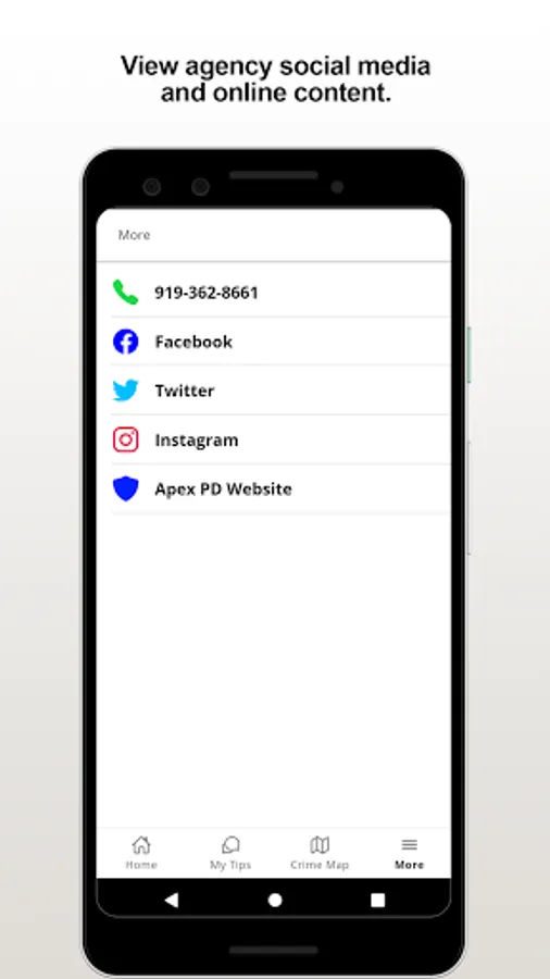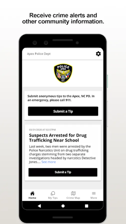 The ApexPD app provides citizens the ability to submit anonymous tips to the Apex, NC Police Department. The app also displays agency crime alerts, online crime map, and other organization web and social media content.