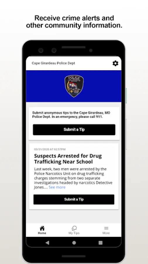 The CapePD Tips app provides citizens the ability to submit anonymous tips to Cape Girardeau, MO Police Department. The app also displays agency crime alerts and other organization web and social media content.