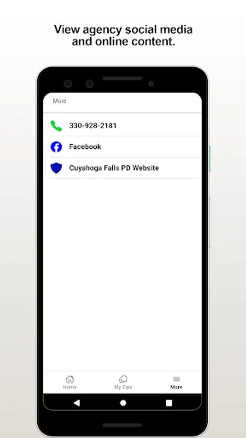 The Cuyahoga Falls PD app provides citizens the ability to submit anonymous tips to the Cuyahoga Falls, OH Police Department. The app also displays agency crime alerts and other organization web and social media content.