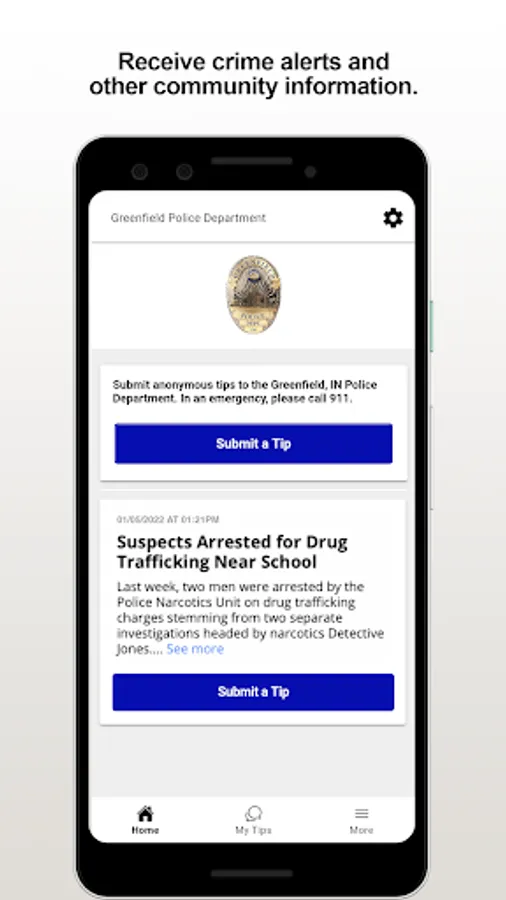 The Greenfield PD app provides citizens the ability to submit anonymous tips to the Greenfield, IN Police Department. The app also displays agency crime alerts and other organization web and social media content.