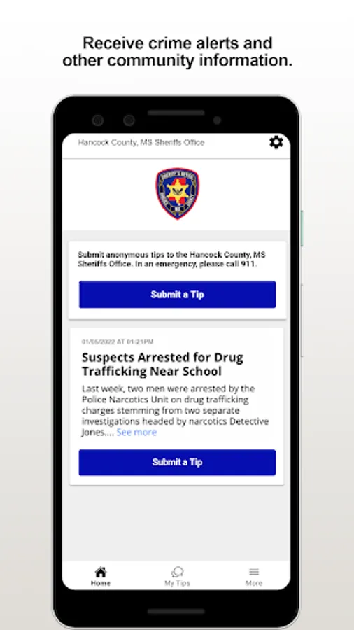 The HCSOMS app provides citizens the ability to submit anonymous tips to the Hancock County, Mississippi Sheriffs Office. The app also displays organization web and social media content.
