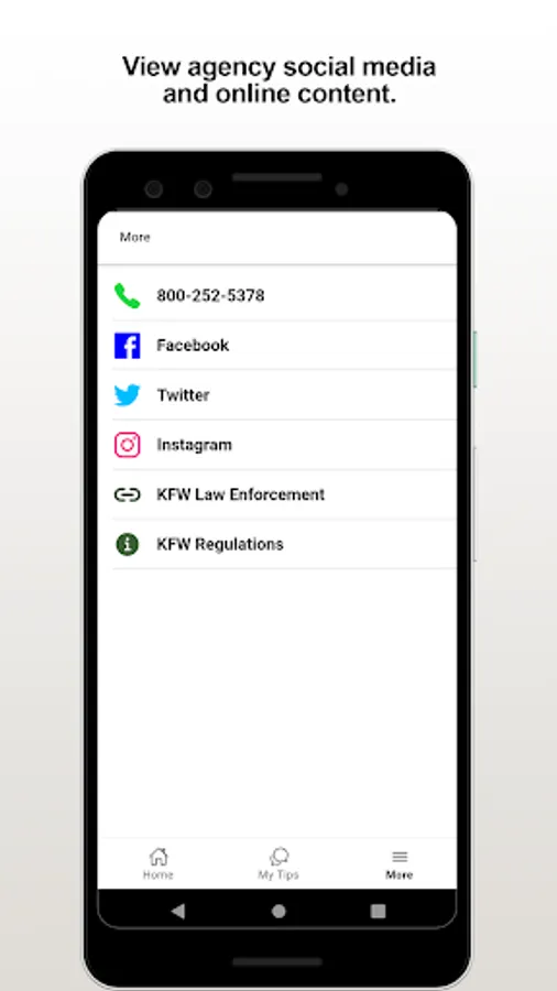 The KFWLaw app provides citizens the ability to submit anonymous tips to the Kentucky Department of Fish & Wildlife Law Enforcement. The app also displays organization web and social media content.