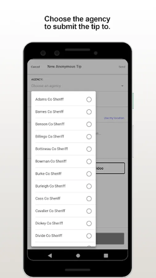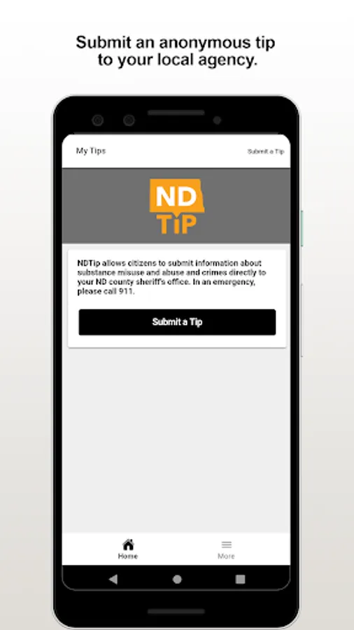 The NDTip allows citizens to submit information about substance misuse and abuse and crimes directly to their North Dakota county sheriff's office. In an emergency, please call 911.
