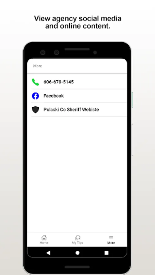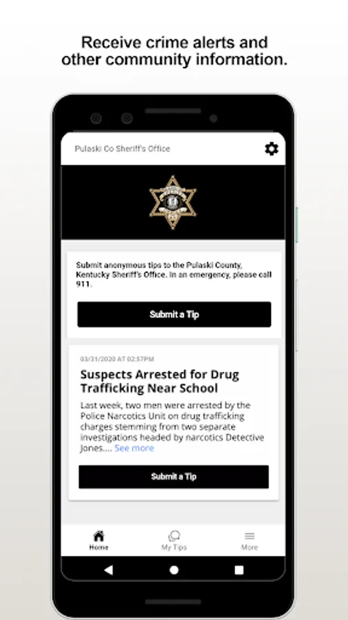The PulaskiCo Sheriff app provides citizens the ability to submit anonymous tips to the Pulaski County, Kentucky Sheriff's Office. The app also displays agency crime alerts and other organization web and social media content.