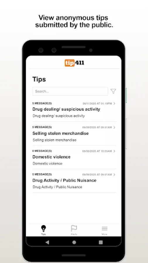 The tip411 Admin app allows tip411 agency users to view anonymous tips submitted by their citizens. The app also lets agency users create alerts (depending upon their tip411 subscription).