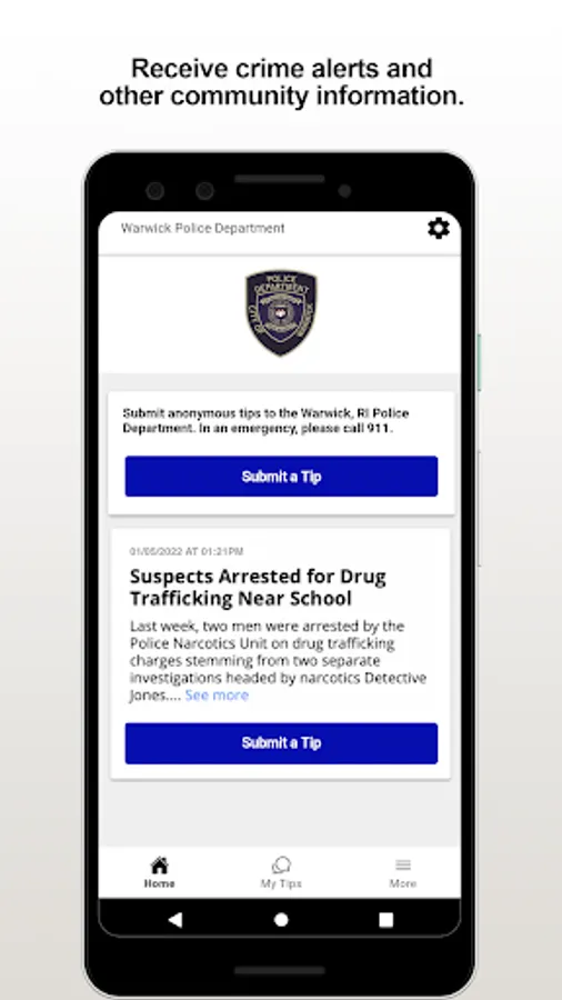 The Warwick PD app provides citizens the ability to submit anonymous tips to the Warwick, RI Police Department. The app also displays agency crime alerts and other organization web and social media content.