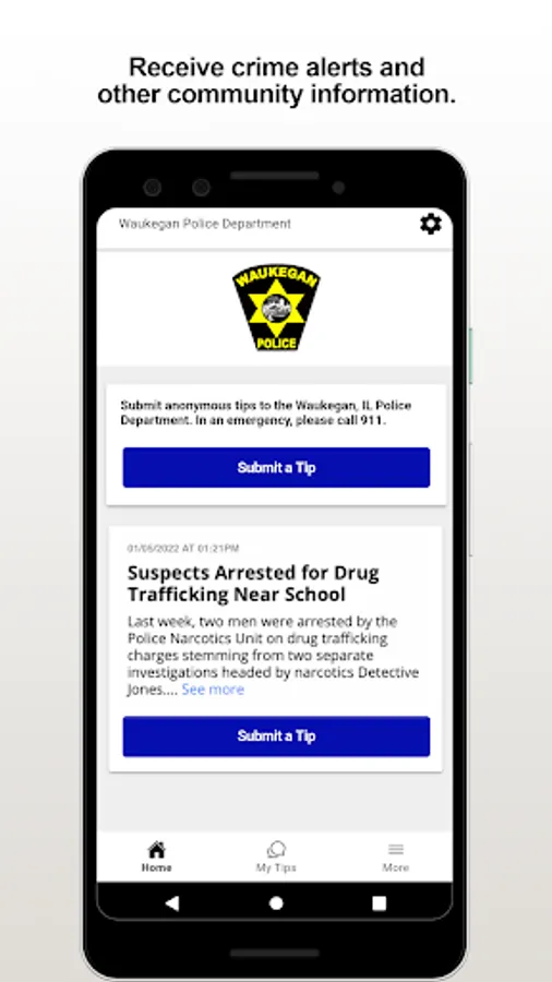The Waukegan PD app provides citizens the ability to submit anonymous tips to the Waukegan, IL Police Department. The app also displays agency crime alerts and other organization web and social media content.