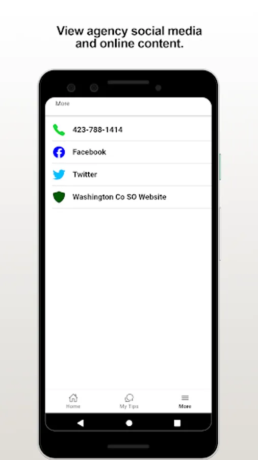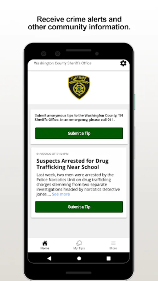 The WCSOTN app provides citizens the ability to submit anonymous tips to the Washington County, TN Sheriffs Office. The app also displays organization web and social media content.