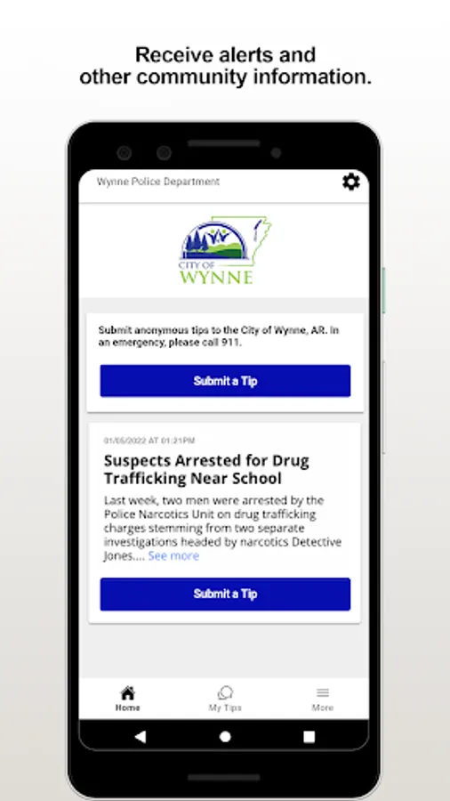 The WynneTip app provides citizens the ability to submit anonymous tips to the City of Wynne, AR. The app also displays public safety alerts and other organization web and social media content.
