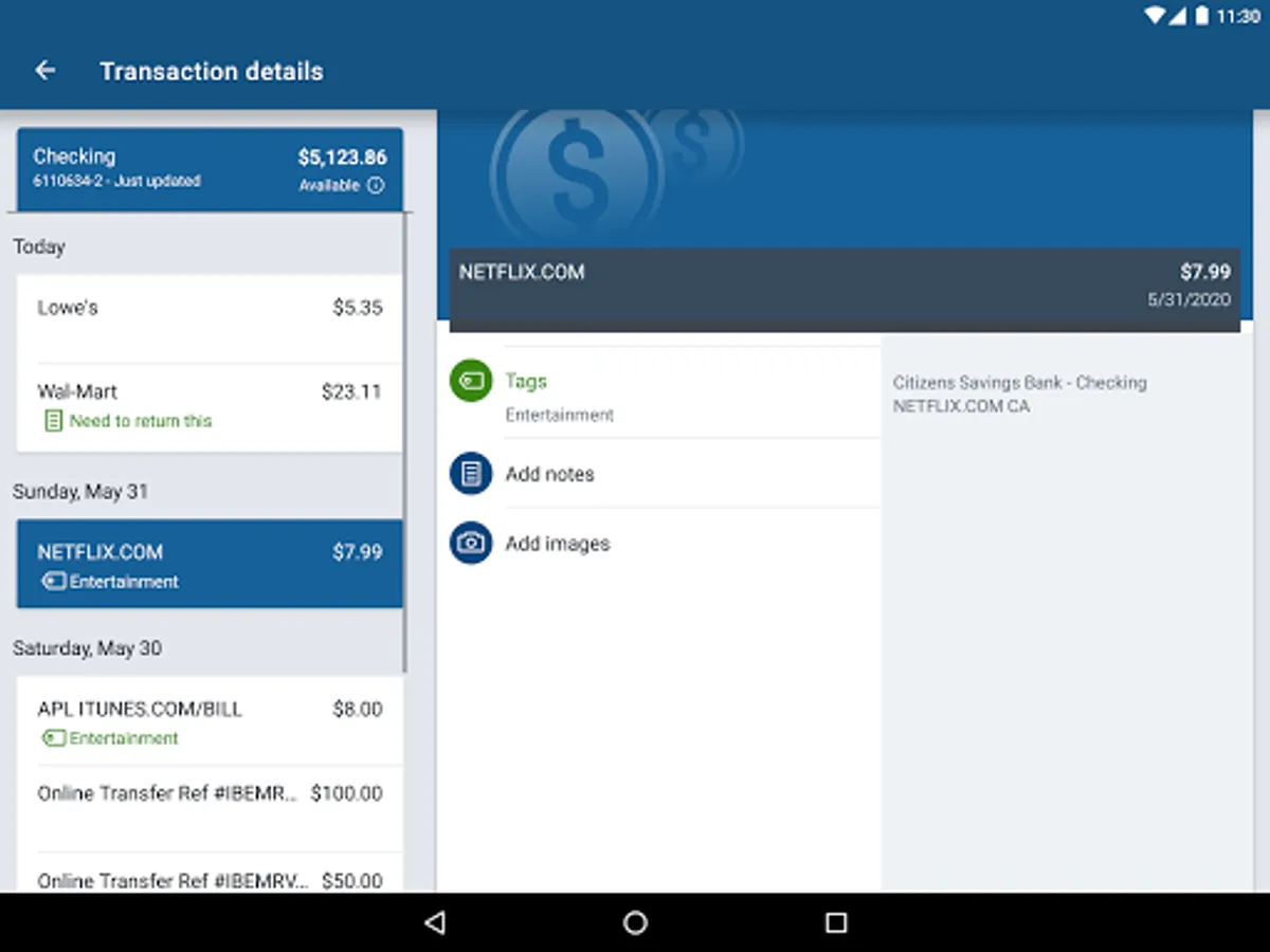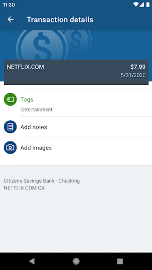 Add Tags, Notes, Images & Geo-Information: By enhancing transactions with custom tags, notes or photos of a receipt or check, you have the ability to stay organized and find exactly what you’re looking for when searching through your finances.