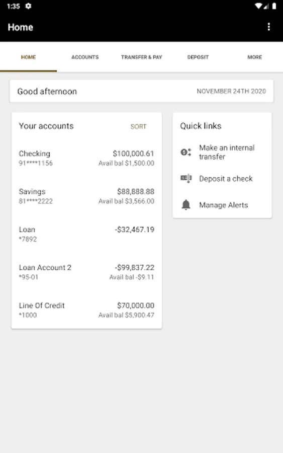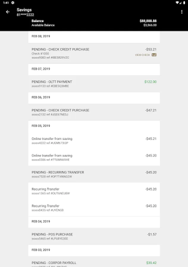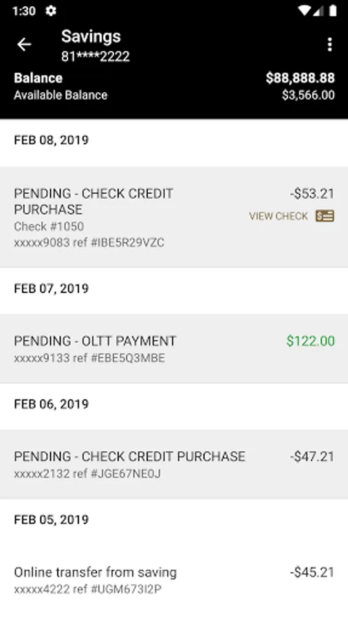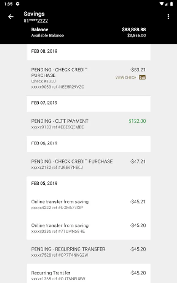 Accounts- Check your latest account balance and search recent transactions by date, amount, or check number.