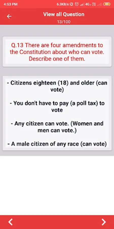 Note :- The actual civics test is NOT a multiple choice test, it is an oral interview. During that interview, a USCIS officer will verbally ask you up to 10 questions from the list of 100 questions in English. You need to answer 6 of the 10 questions correctly to pass the civics test. Our Android app is designed to help you improve your oral and listening skills if English isn’t your first language. Many users have passed their tests using our app, and you will too! Good luck!