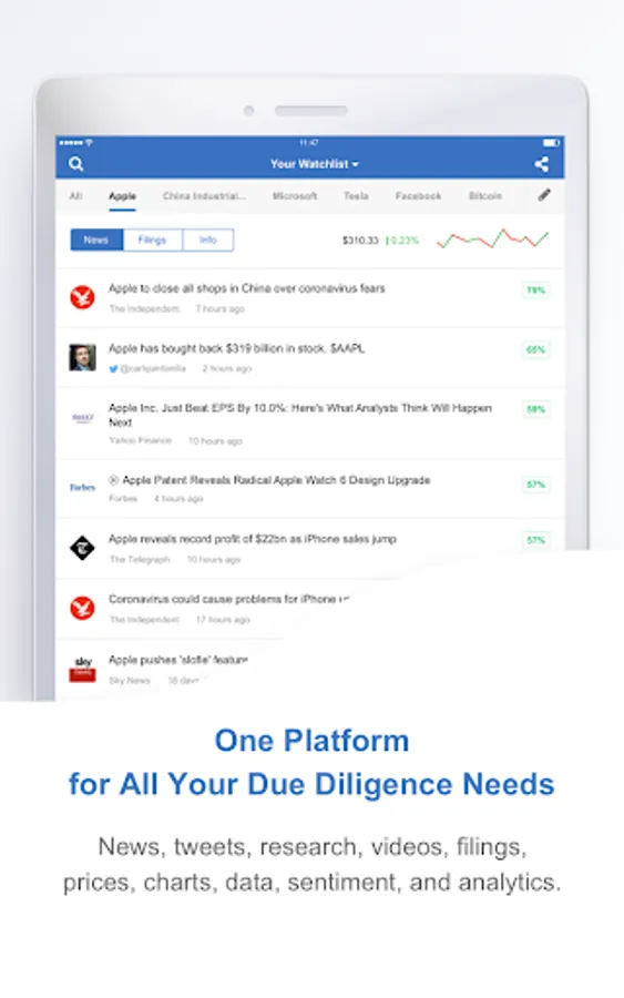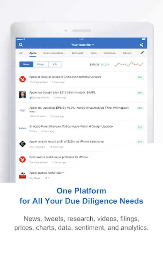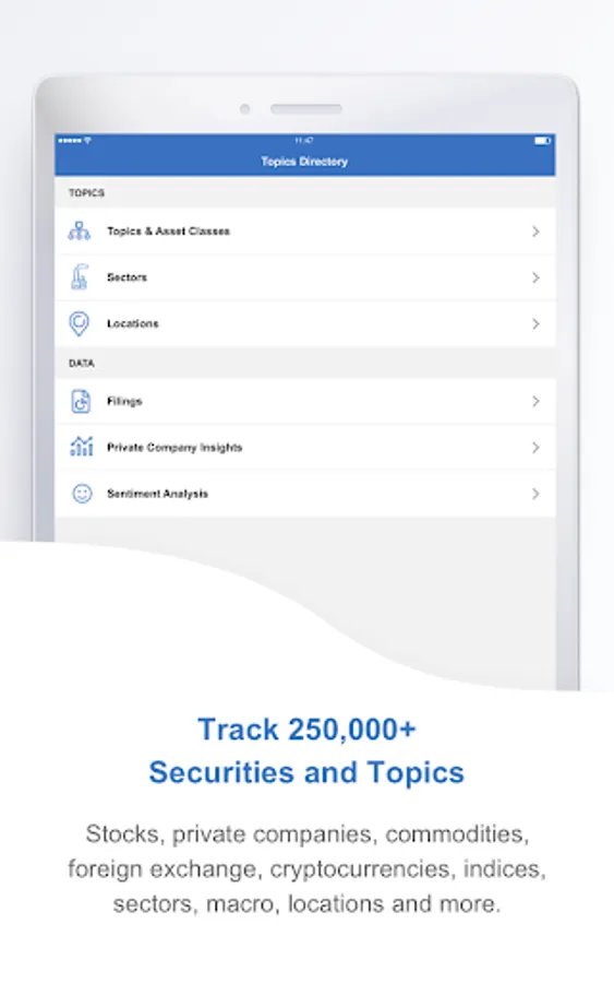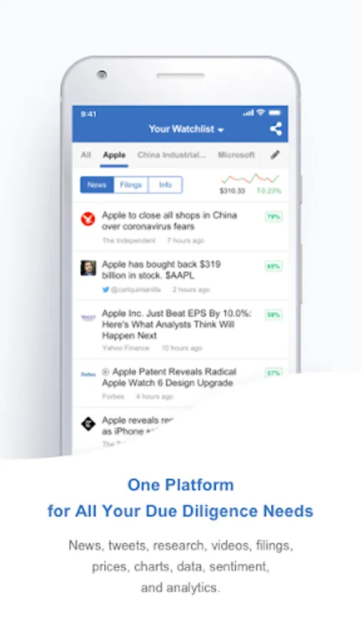 - Watchlists to track 300k+ topics including stocks, private companies, and any combination of entities across our 27 asset and topic classes