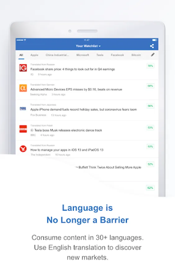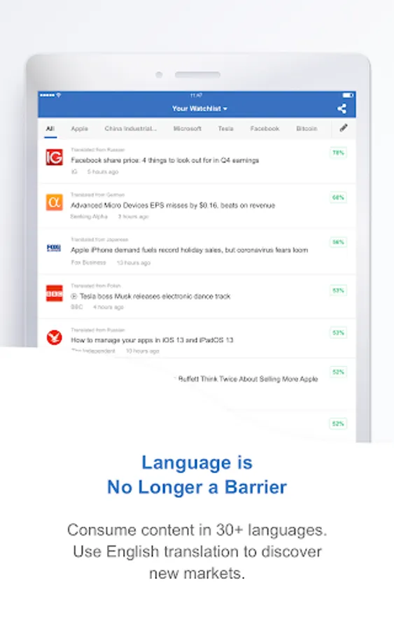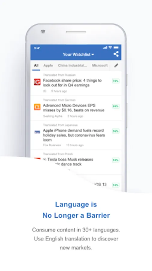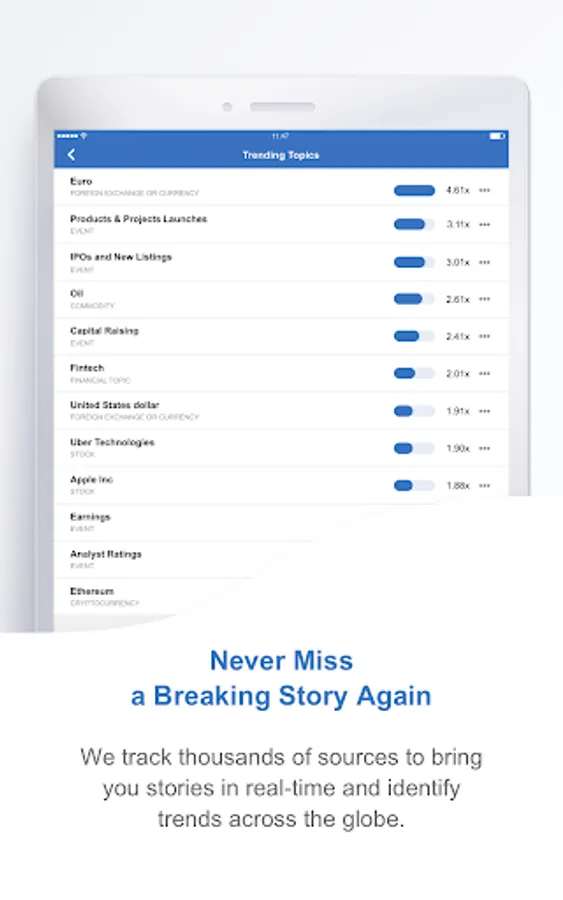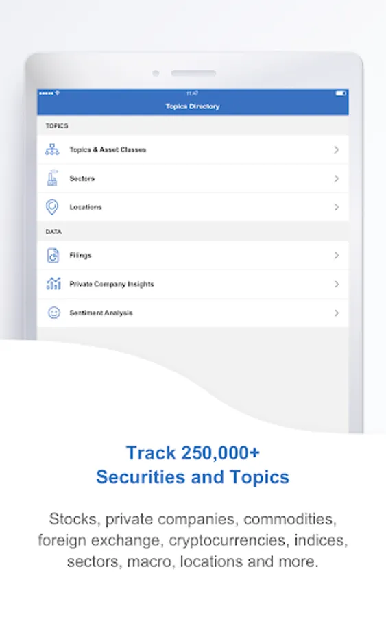 - Content from 13k+ publications, Twitter, regulatory agencies and stock exchanges, alternative data providers, and our own analytics and insights