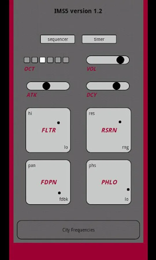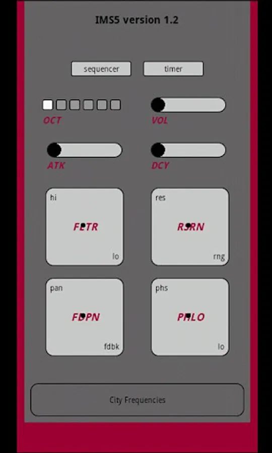 City Frequencies have produced this synth primarily for determining any audio latency concerns from our test devices and to provide a framework for later use in sound installation performance software. This first release, IMS5, utilises basic interface components so as to require less processor use in low powered devices and allow audio generating to take precedence.