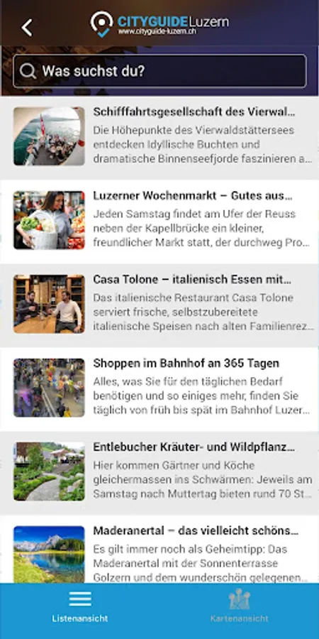 The new CITYGUIDE Lucerne app shows you the best sights, accommodations, restaurants, bars and much more. With the integrated City Map you will find the most interesting places and events thanks to the unique online City Guide - the quickest way to get to the nearest restaurant or ATM. Browse the many carefully compiled lists of the best experiences and activities. Discover great insider tips for Lucerne, depending on where you are and where you are going. You can find us online at www.cityguide-luzern.ch.