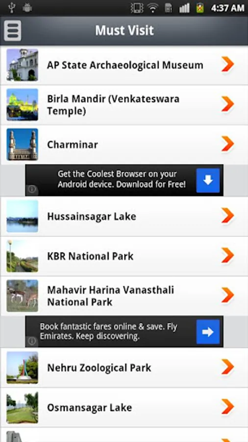 Must Visit: Hyderabad offers pleasant and exciting surroundings such as Charminar, Mecca Masjid, Golconda Fort, Taramati Baradari, Salar Jung Museum, Birla Mandir (Venkateswara Temple), AP State Archaeological Museum, Nehru Zoological Park, Shilparamam, Hussainsagar Lake, KBR National Park. Osmansagar Lake, Hyderabad Botanical Gardens, Mahavir Harina Vanasthali National Park full details from within the app.