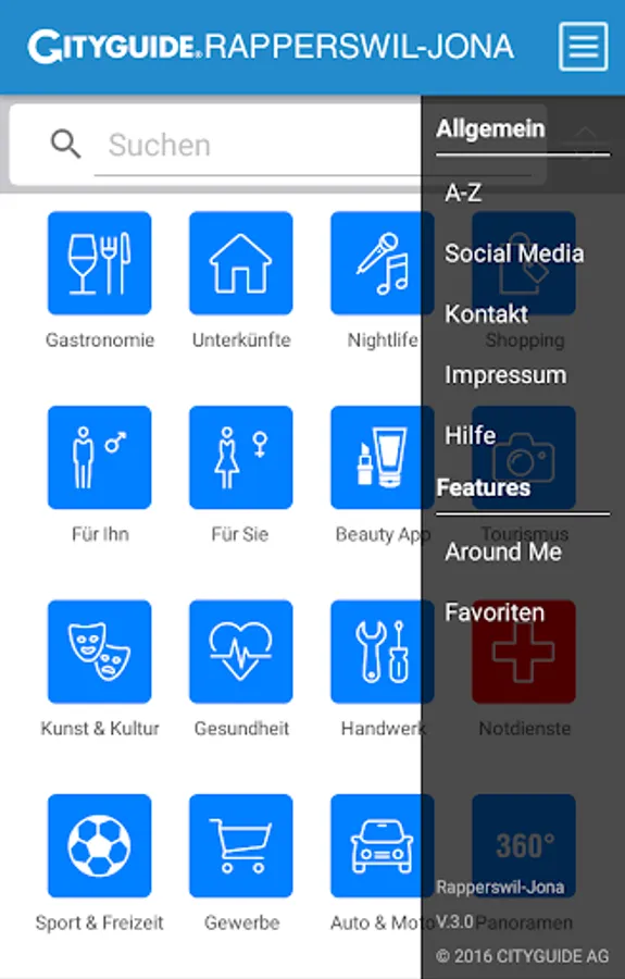 With the CITYGUIDE Rapperswil-Jona you have the entire city digital for your trouser pocket and all the important information around the clock at your fingertips. With the CITYGUIDE you get information about events, top locations, industries and companies on site. Go on a virtual city walk to the shops with the 360 ° panorama function, view opening times, services and brands. Find the nearest restaurant, the next florist, baker or fashion shop with the Search & Around Me feature and benefit from special promotions (offers & coupons) at CITYGUIDE Rapperswil-Jona.