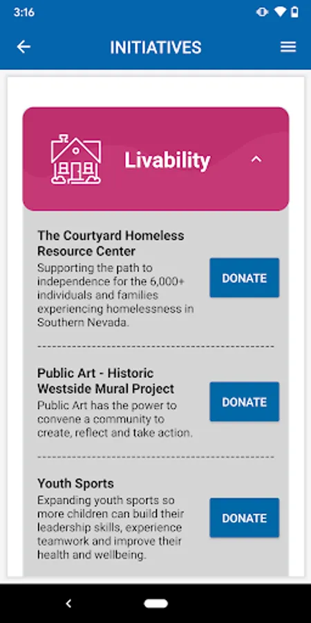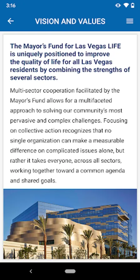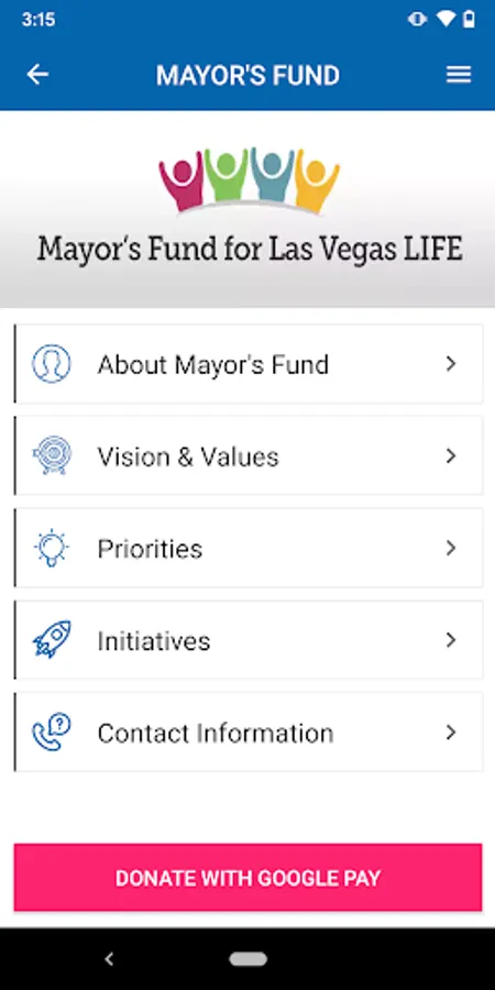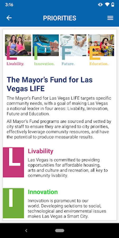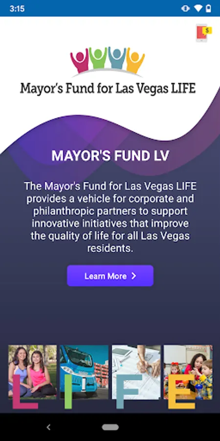 The Mayor’s Fund for Las Vegas LIFE App is a mobile application that shares information about the various programs and initiatives within the Mayor’s Fund for Las Vegas LIFE program. The Mayor’s Fund’s mission is to advance the City of Las Vegas’ Livability, Innovation, Future, and Education (LIFE) by bringing together public-private partners to address the city’s most pressing needs through collaborative and transformational problem solving. The Mayor’s Fund for Las Vegas LIFE is uniquely positioned to improve the quality of life for all Las Vegas residents and strives to solve the community’s most pervasive and complex challenges through cooperative work and shared stakeholder funding. This mobile application describes the programs in the Mayor’s Fund and outlines various opportunities to donate to the Mayor’s Fund.