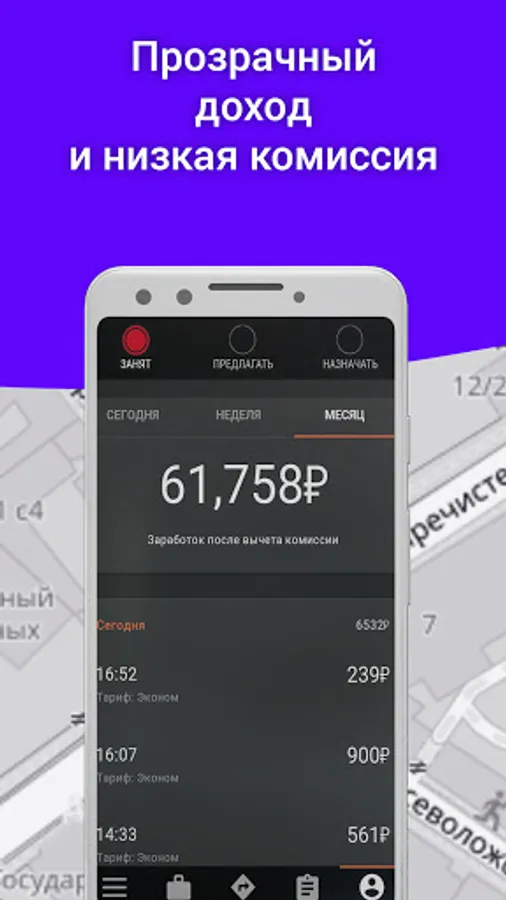 One of the important advantages of Citymobil for drivers in comparison with other taxi services is the low commission. No hidden charges for withdrawing funds, monthly fees and other additional payments. All information on income for the day, week and month can be viewed in the City Mobile application.