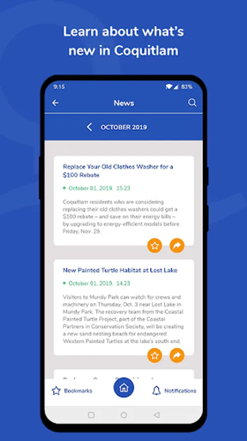 Connect with the City of Coquitlam anywhere, anytime with a few clicks on your phone. CoquitlamConnect allows you to check out City events, locate nearby facilities, catch up on news in your community and gain access to online services – all in one place. The app also allows users to customize the content they see on the app, by favouriting the news, events and content they are most interested in.
