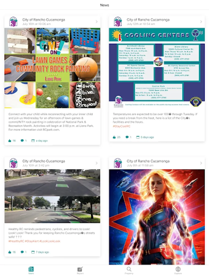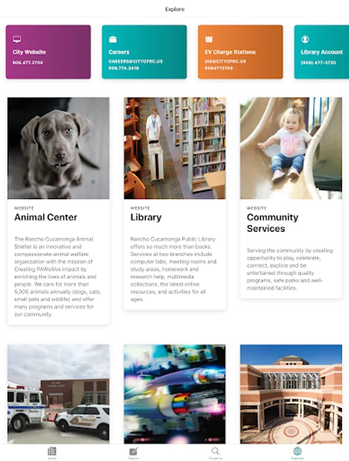 RC2GO is intended to improve the service delivery to everyone who lives, works, and plays in our community. Use the news section to stay up to date with what's going on in Rancho Cucamonga. Submit reports about things you see throughout our city while you're out and about. Search for information about your property to find out what your trash day is or what school district you are in and much more. Use the explore section to look at the many programs and services we offer. All of this and much more in the all new version of RC2GO.