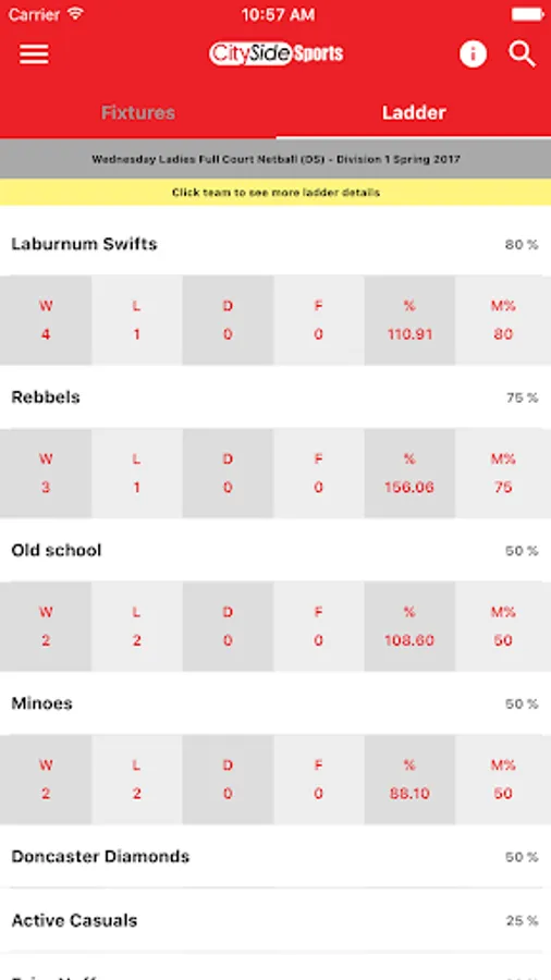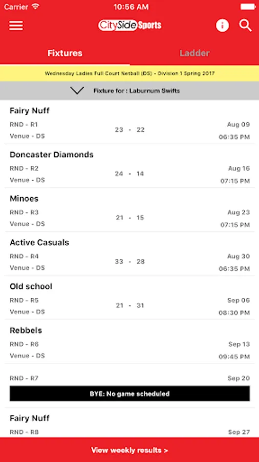 The CitySide Sports app is for use by players of CitySide Sports Pty Ltd, allowing users to have quick view of their team fixtures, results and ladders. Game time reminders can be sent. More features will be added that will allow teams to register for upcoming seasons and tournaments, track team payments and team message boards.