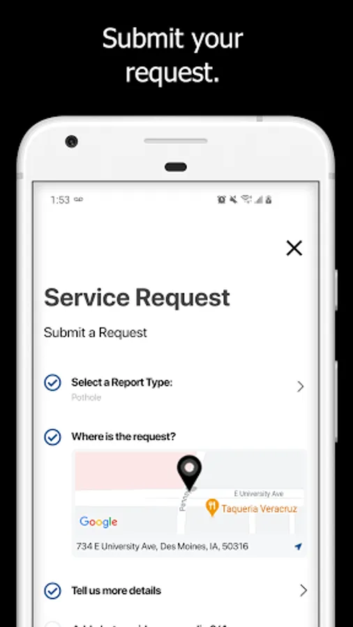 Report problems where and when you find them! With myDSMmobile, you can reach out to your City government right from the palm of your hand. Use your smartphone to report any of the most common complaints or services with GPS-enabled photo or video built right in. Keep track of requests for service and problem complaints in your neighborhood with real-time updates online. Remember, a geo-coded picture's worth more than a thousand words!