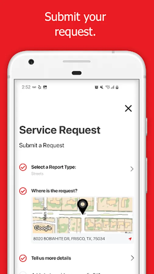 myFRISCO is a real time, public engagement tool designed to alert staff about problems related to certain city services. It’s a free, simple and intuitive tool providing a platform for reporting concerns, 24/7. Users document problems by reporting – and / or taking photos with their mobile phones and uploading to the myFRISCO app. This service targets issues related to water, sewer, streets, traffic signals, lighting, signage, recycling & trash, animal control and code enforcement. myFRISCO is a convenient way to report a problem and monitor progress as our staff works on a solution. Our employees strive to deliver outstanding customer service and operational excellence. Even so, we need your 'extra eyes and ears' to help us do this. Engage the myFRISCO app and be part of our "Progress in Motion".