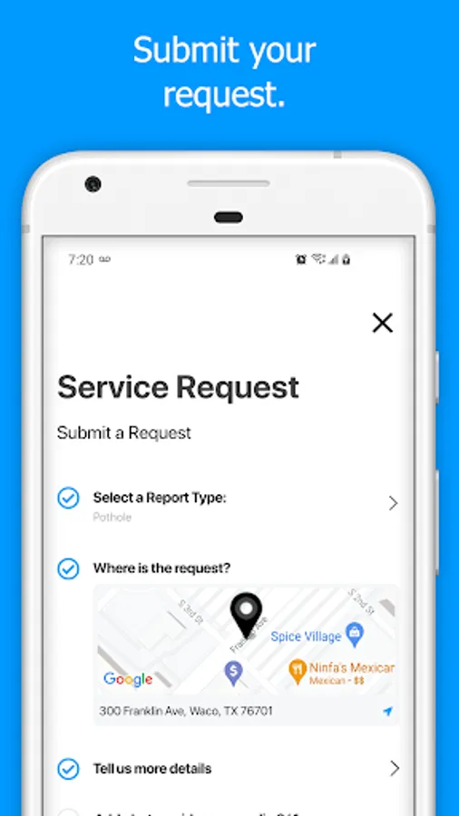 Whether you live here, work here, or play here, this free, easy-to-use APP allows you to submit service requests for code violations, potholes, streetlight outages, unsafe conditions and more directly from your mobile device. Service requests are routed to the appropriate department for attention and will be responded to quickly and efficiently, and you'll be notified when they are resolved.