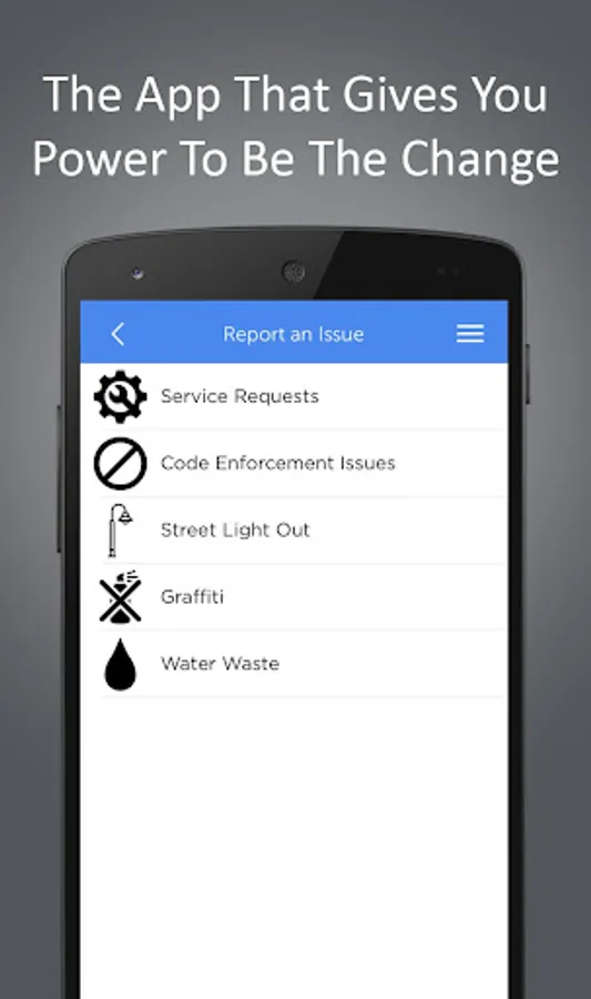 Use the Issue Reporting section to report graffiti, potholes and other issues directly to the correct city department right from your phone. The issues are tracked from the initial report to resolution in the "My Reports" section and you will receive push notifications as your report progresses.