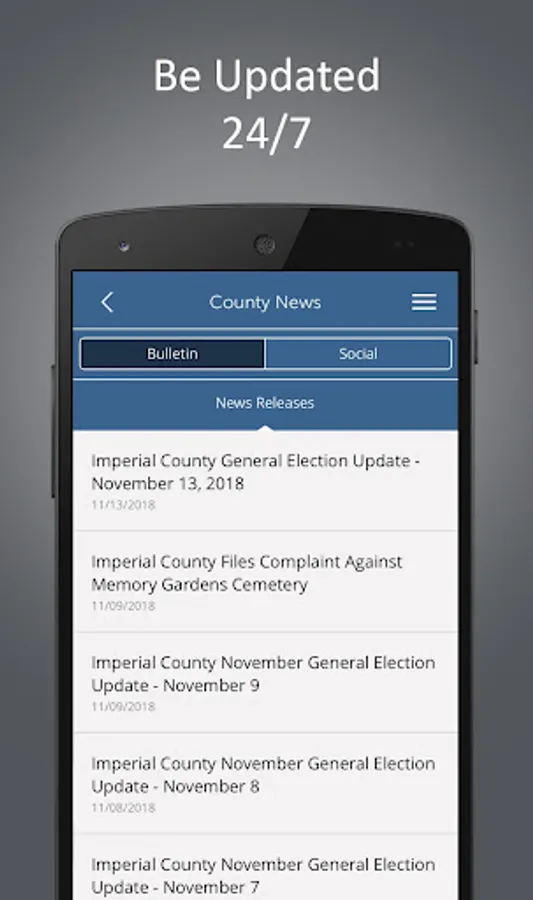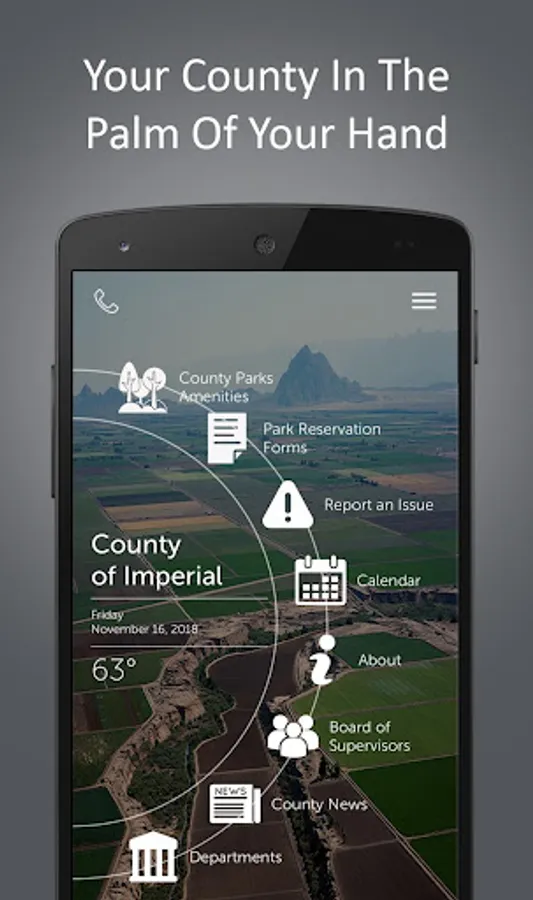 Engage with your county like never before by downloading the official app for the County of Imperial, CA. With features like Departments, County Park Ameneties, News, Calendar, and Report an Issue you'll find it easier then ever to stay connected with your county with just a few taps on your mobile device.